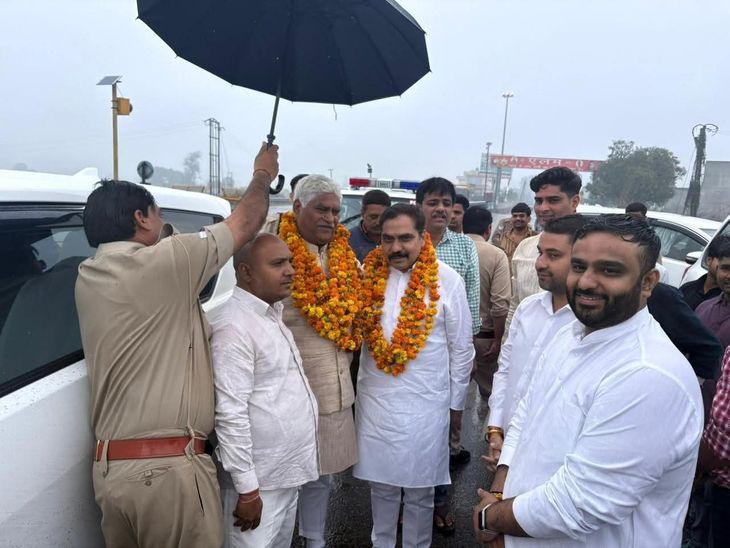 बारिश में मंत्री का छाता पकड़े दिखा हेड कांस्टेबल:कलेक्ट्रेट के कार्यक्रम में पहुंचे थे, तस्वीर की सोशल मीडिया पर चर्चा