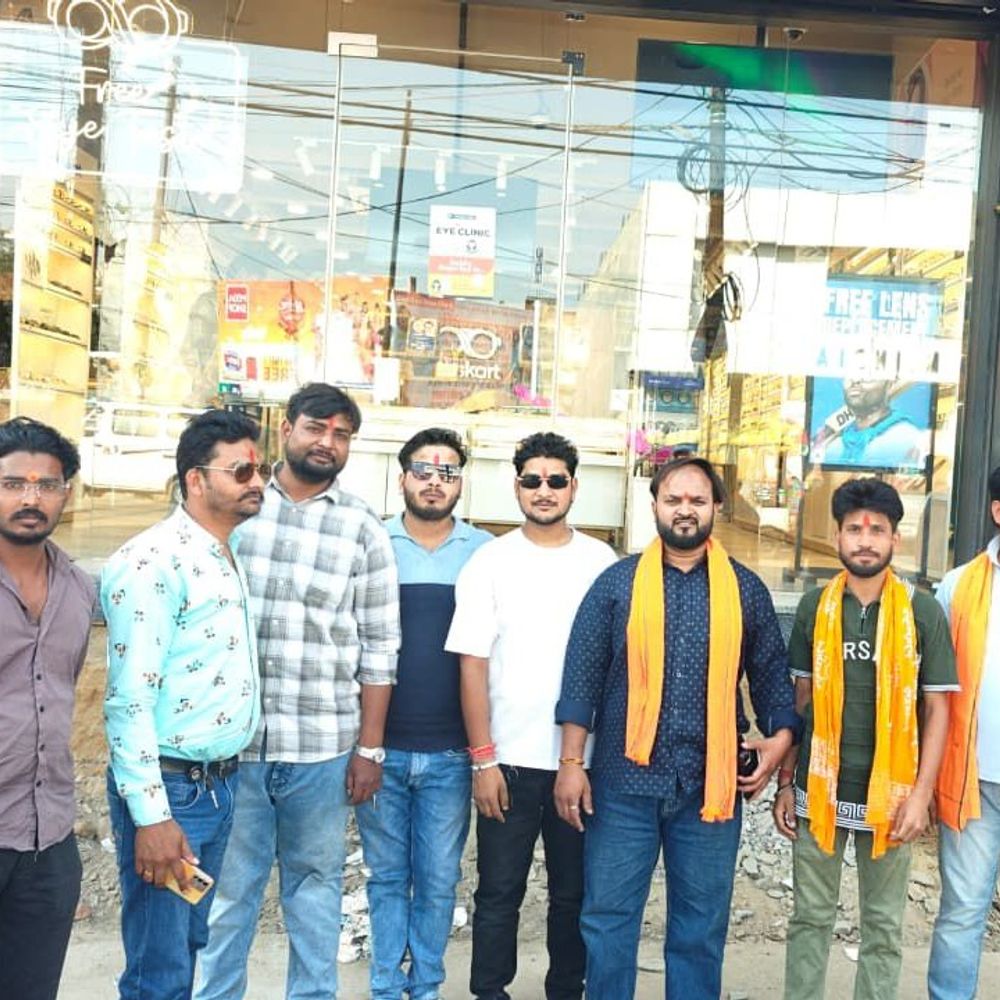 लेंसकार्ट शोरूम पर हिंदू रक्षा दल का प्रदर्शन:फर्रुखाबाद में कर्मचारियों को तिलक लगाकर जताया विरोध, 'जय श्री राम' के नारे
