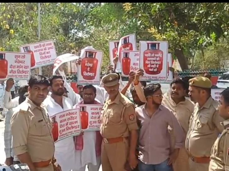 सपा ने गैस सिलेंडर किल्लत पर प्रदर्शन किया:बहराइच में कालाबाजारी रोकने और समय पर आपूर्ति की मांग