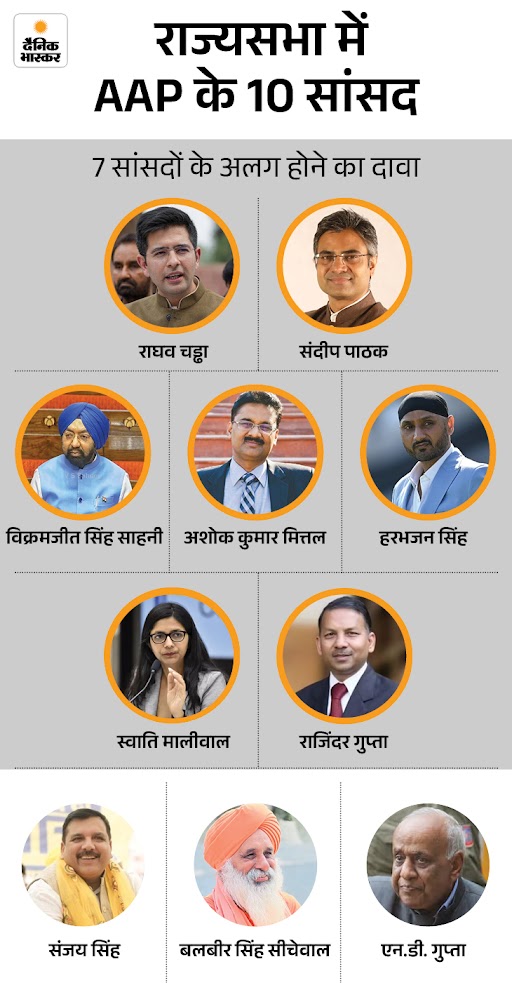 AAP के 10 राज्यसभा सांसदों में से राघव चड्‌ढा, अशोक मित्तल और संदीप पाठक, हरभजन सिंह, विक्रमजीत सिंह साहनी, स्वाति मालीवाल, राजेंदर गुप्ता ने शुक्रवार को BJP जॉइन कर ली थी।