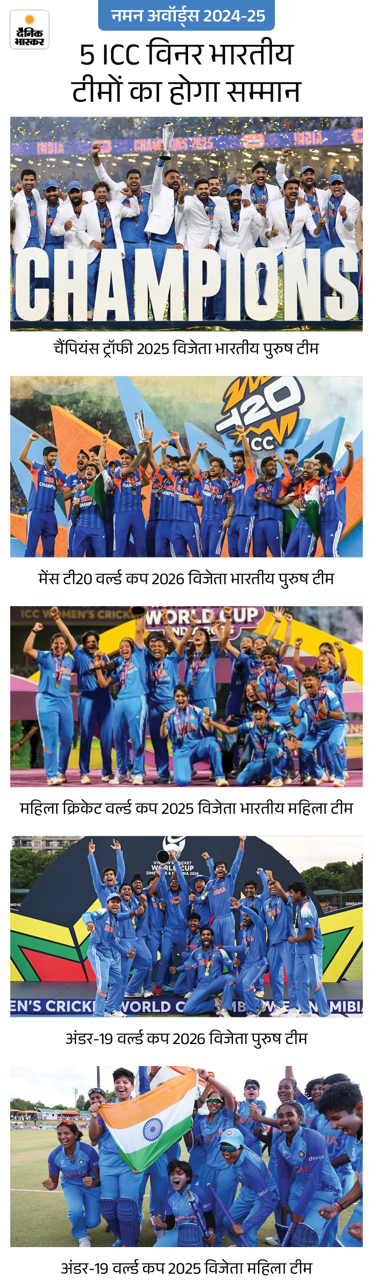 समारोह में कई घरेलू क्रिकेटर्स को भी सम्मान मिलेगा। यहां भारत की पांच ICC ट्रॉफी जीतने वाली टीमों का विशेष रूप से सम्मान किया जाएगा, जो भारतीय क्रिकेट के लिए ऐतिहासिक उपलब्धि मानी जा रही है।