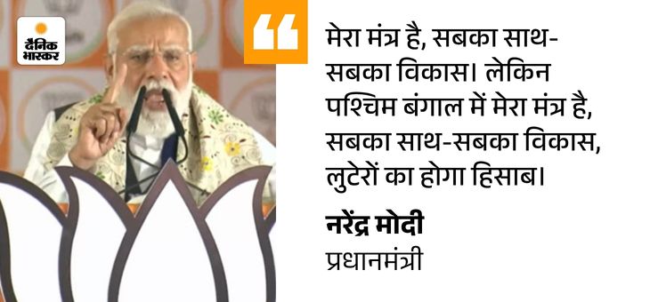 рдкреАрдПрдо рдореЛрджреА рдЧреБрд░реБрд╡рд╛рд░ рдХреЛ рдкрд╢реНрдЪрд┐рдо рдмрдВрдЧрд╛рд▓ рдореЗрдВ 3 рдЪреБрдирд╛рд╡реА рд░реИрд▓рд┐рдпрд╛рдВ рдХреАрдВред рдЙрдиреНрд╣реЛрдВрдиреЗ рдмреАрд░рднреВрдорд┐ рдореЗрдВ рдХрд╣рд╛, тАШрд╣рдо рдРрд╕рд╛ рд╕рдорд╛рдЬ рджреЗрдЦрдиреЗ рдЪрд╛рд╣рддреЗ рд╣реИрдВред рдЬрд╣рд╛рдВ рд╣рд░ рдХреЛрдИ рднрдп рд╕реЗ рдореБрдХреНрдд рд╣реЛред рдпреЗ рдорд╛рдВ, рдорд╛рдЯреА рдФрд░ рдорд╛рдиреБрд╖ рдХреА рдмрд╛рдд рдХрд░рддреЗ рд╣реИрдВред рдорд╛рдВ рдЖрдЬ рд░реЛ рд░рд╣реА рд╣реИ, рдорд╛рдЯреА рдкрд░ рдШреБрд╕рдкреИрдард┐рдпреЛрдВ рдХрд╛ рдХрдмреНрдЬрд╛ рд╣реЛ рд░рд╣рд╛ рд╣реИ рдФрд░ рдорд╛рдиреБрд╖ рднрдпрднреАрдд рд╣реИ, рдбрд░рд╛ рд╣реБрдЖ рд╣реИредтАЩ