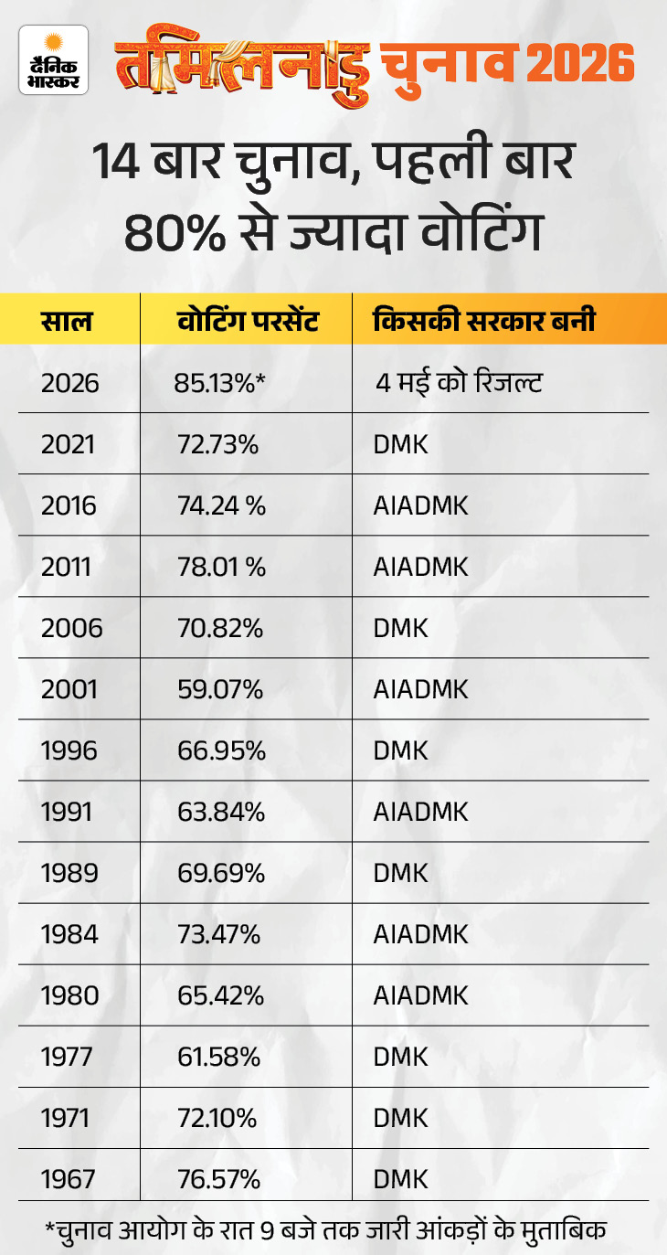 तमिलनाडु की सभी 234 सीटों पर 85.14% वोटिंग हुई। दोनों राज्यों में आजादी के बाद अब तक सबसे ज्यादा वोटिंग हुई है। इससे पहले तमिलनाडु में सबसे ज्यादा मतदान 2011 में 78.29% था, जबकि बंगाल में 2011 में 84.72% मतदान दर्ज किया गया था।