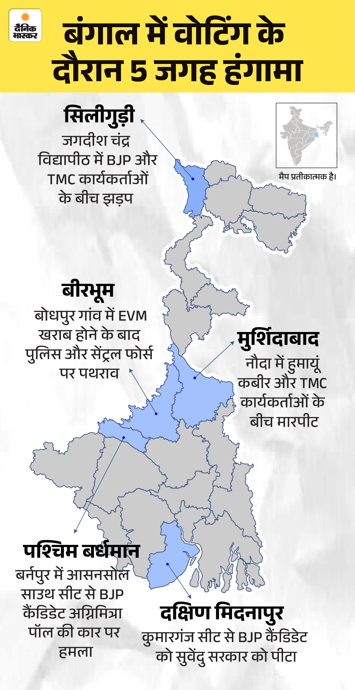- बंगाल के दक्षिण मिदनापुर में कुमारगंज सीट से भाजपा कैंडिडेट सुवेंदु सरकार को भीड़ ने दौड़ा-दौड़ाकर पीटा। उनका सिक्योरिटी गार्ड उनके साथ था। इसके बावजूद भीड़ ने उन्हें खदेड़ दिया।