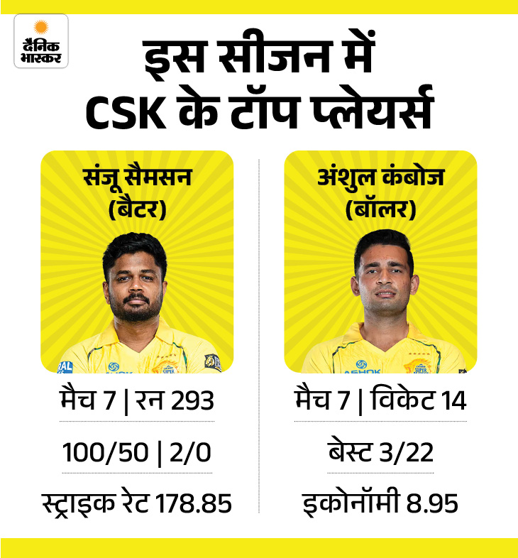 CSK के लिए इस सीजन में संजू सैमसन ने बेहतरीन बल्लेबाजी की है। उन्होंने मुंबई के खिलाफ सीजन का दूसरा शतक जड़ा था। इससे पहले गुजरात के खिलाफ भी उन्होंने सेंचुरी लगाई थी। टीम का मिडिल ऑर्डर अब भी चिंता का विषय है। शिवम दुबे, सरफराज खान और डेवाल्ड ब्रेविस अच्छी शुरुआत को बड़े स्कोर में नहीं बदल पा रहे हैं।