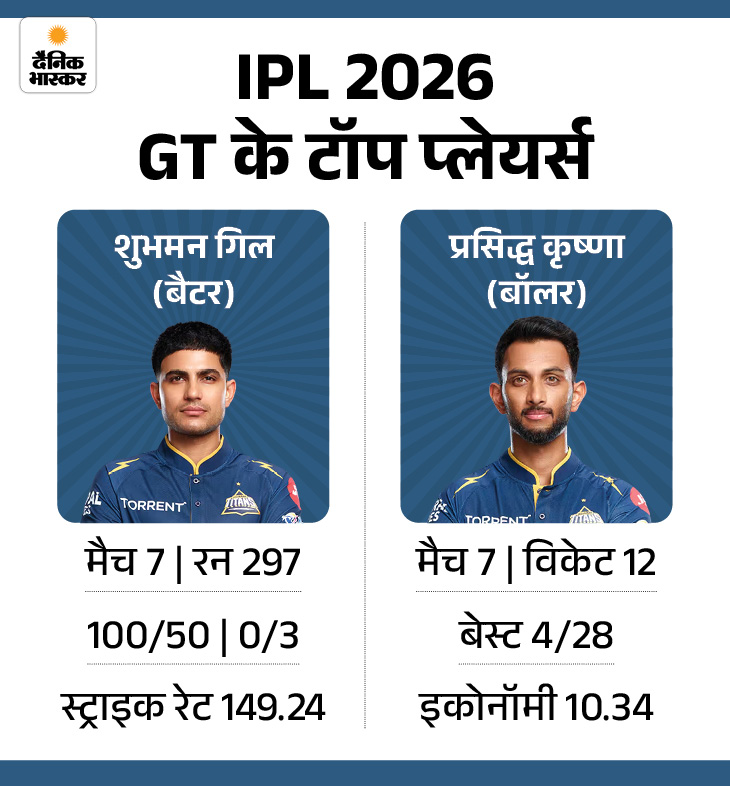 गुजरात की ओर से गिल टॉप रन स्कोरर हैं। उन्होंने 149.24 की स्ट्राइक रेट से 297 रन बनाए हैं। गेंदबाजी में मोहम्मद सिराज, कगिसो रबाडा और प्रसिद्ध कृष्णा जैसे बड़े नामों के बावजूद टीम निरंतरता की कमी से जूझ रही है।