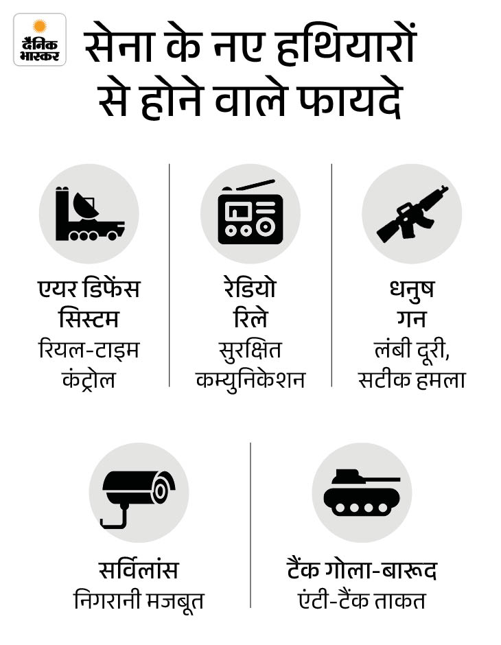 भारतीय सेना के लिए एयर डिफेंस ट्रैक्ड सिस्टम, आर्मर पियर्सिंग टैंक गोला-बारूद, हाई कैपेसिटी रेडियो रिले, धनुष गन सिस्टम और रनवे इंडिपेंडेंट एरियल सर्विलांस सिस्टम को मंजूरी मिली।