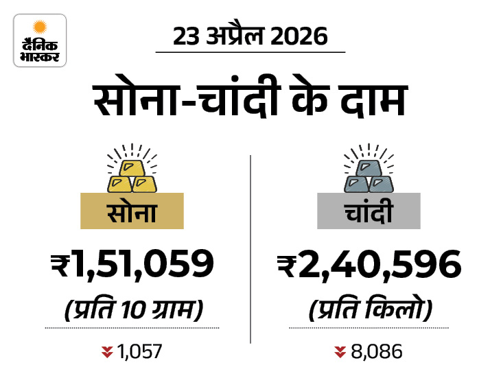सोना-चांदी के दाम में 23 अप्रैल को गिरावट रही। इंडिया बुलियन एंड ज्वेलर्स एसोसिएशन (IBJA) के अनुसार, 10 ग्राम 24 कैरेट सोना 1,057 रुपए गिरकर 1.51 लाख रुपए पर आ गया है। इससे पहले 22 अप्रैल को इसकी कीमत 1.52 लाख रुपए प्रति 10 ग्राम थी।