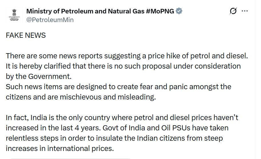 सरकारी बयान में इस बात पर जोर दिया गया है कि भारत दुनिया का एकमात्र ऐसा बड़ा देश है, जहां पिछले 4 साल में पेट्रोल और डीजल की कीमतों में बढ़ोतरी नहीं हुई है। अंतरराष्ट्रीय बाजार में कच्चे तेल की कीमतों में उतार-चढ़ाव के बावजूद भारत में घरेलू कीमतें स्थिर बनी हुई हैं।