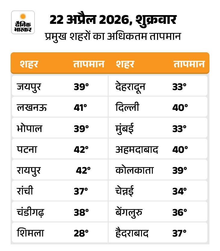 राजस्थान में सोमवार को 12 शहरों में तापमान 40°C या उससे ऊपर दर्ज हुआ। सबसे ज्यादा तापमान कोटा में 42°C रिकॉर्ड हुआ। बाड़मेर में रात का न्यूनतम तापमान 29.6°C दर्ज हुआ।