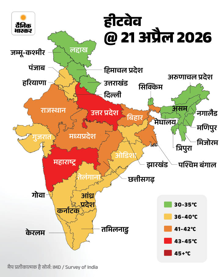 एमपी, यूपी, बिहार, महाराष्ट्र, झारखंड, ओडिशा और राजस्थान में हीटवेव का अलर्ट है। अरुणाचल प्रदेश, असम और मेघालय में भारी बारिश हो सकती है।