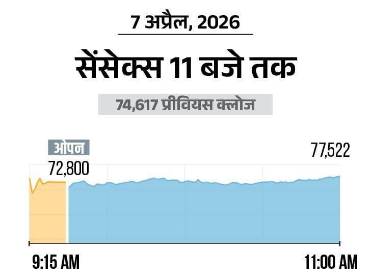 अमेरिका और ईरान के बीच 2 हफ्ते के सीजफायर के ऐलान के बाद आज यानी बुधवार 8 अप्रैल को शेयर बाजार में तेजी है। सेंसेक्स 3000 अंक (3.95%) चढ़कर 77,600 पर कारोबार कर रहा है। निफ्टी भी 9000 अंक (3.80%) ऊपर है, ये 24,000 पर पहुंच गया है।