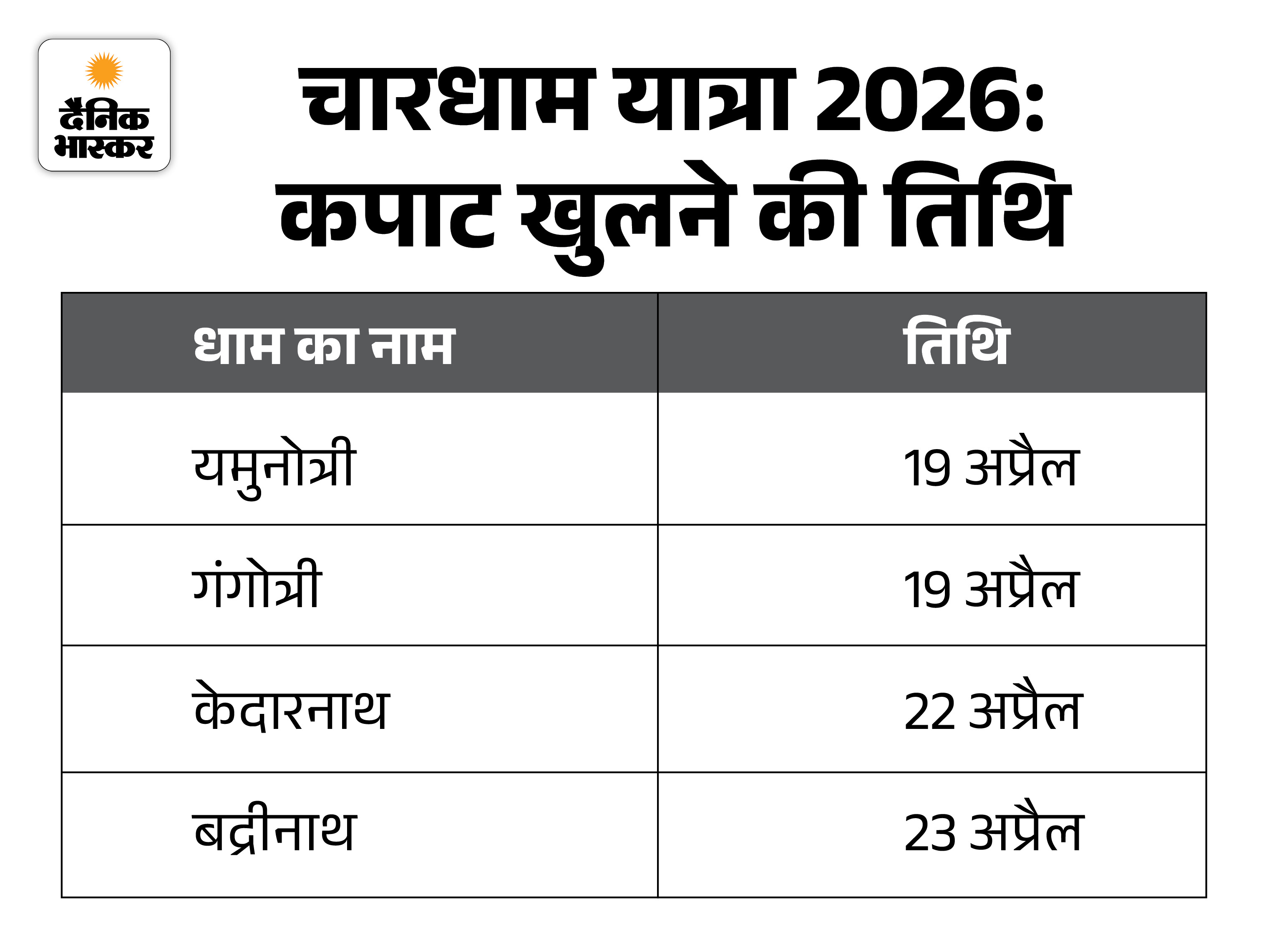 केदारनाथ धाम के कपाट 22 अप्रैल 2026 को सुबह 8 बजे श्रद्धालुओं के लिए खोले जाएंगे। यह तिथि महाशिवरात्रि (15 फरवरी 2026) के अवसर पर ऊखीमठ में पारंपरिक पंचांग गणना के बाद घोषित की गई थी। इस साल केदारनाथ यात्रा पिछले साल की तुलना में पहले शुरू हो रही है। 2025 में धाम के कपाट 2 मई को खुले थे, यानी श्रद्धालु इस बार 10 दिन पहले बाबा केदार के दर्शन कर सकेंगे।