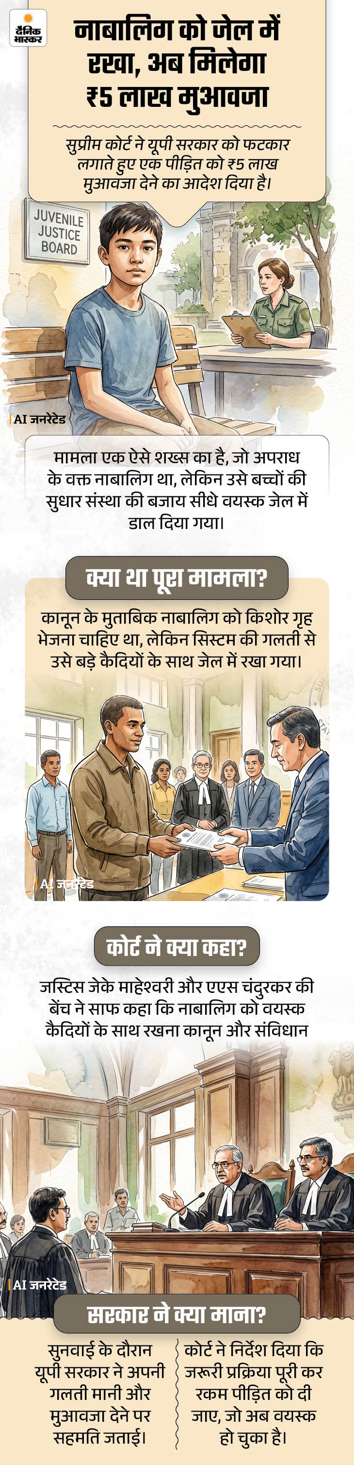 उत्तर प्रदेश में एक नाबालिग को जेल भेज दिया गया, जिसके बाद सुप्रीम कोर्ट ने सरकार को फटकार लगाई और ₹5 लाख मुआवजा देने का एलान किया। वहीं, जापान की एक महिला को गोलगप्पे इतने पसंद आए कि वह अब टोक्यो में इसकी दुकान खोलेंगी।