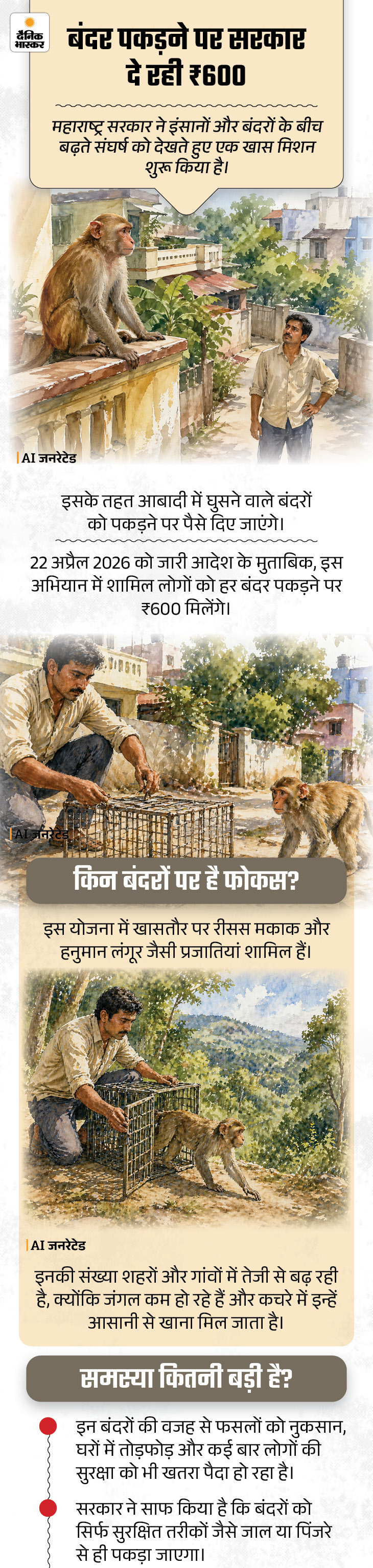 महाराष्ट्र में बंदर पकड़ने पर राज्य सरकार प्रति बंदर ₹600 देगी। वहीं, जापान में डेटिंग ऐप का इस्तेमाल करने पर सरकार ₹12 हजार की सब्सिडी दे रही है। उधर, ओडिशा में एक डॉग 30 बच्चों को जहरीले सांप से बचाने के दौरान खुद शहीद हो गया।