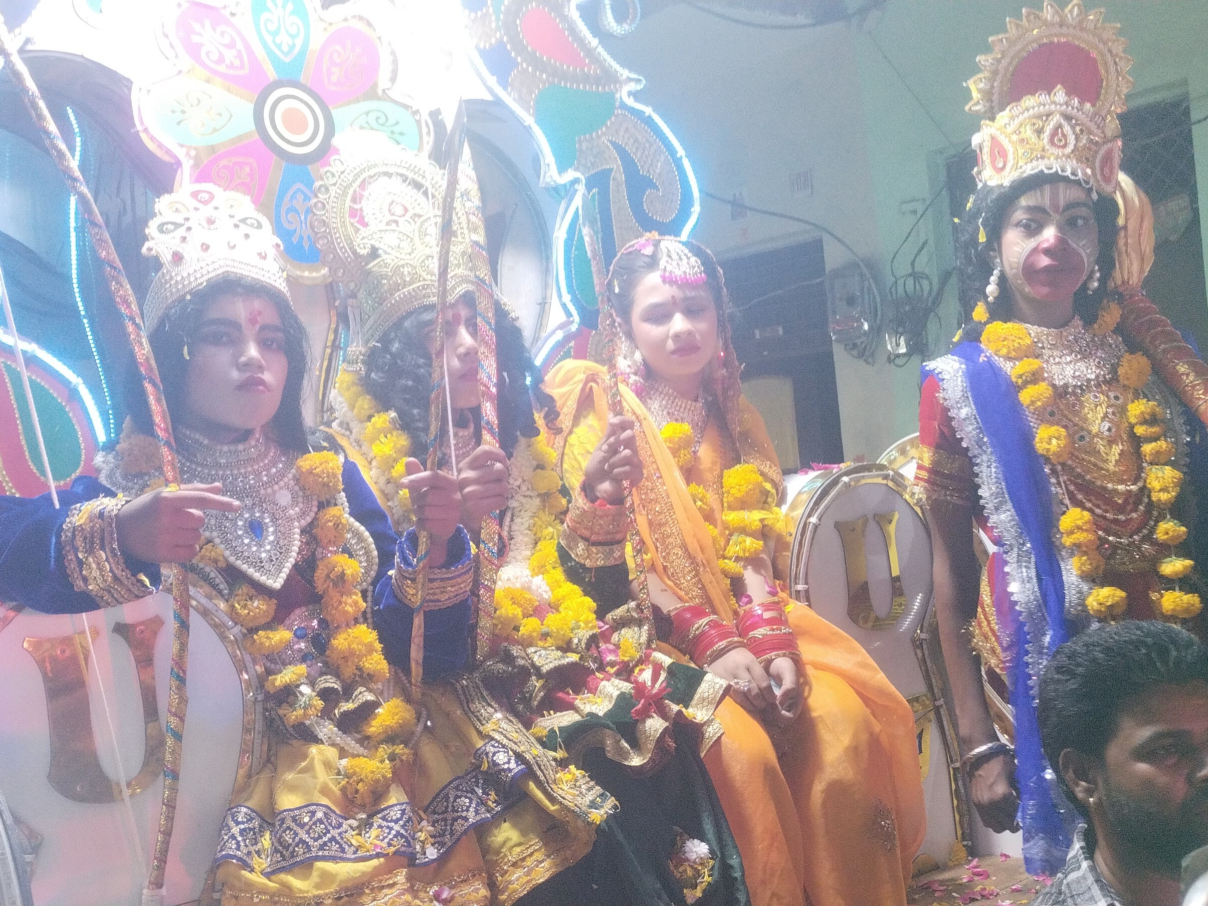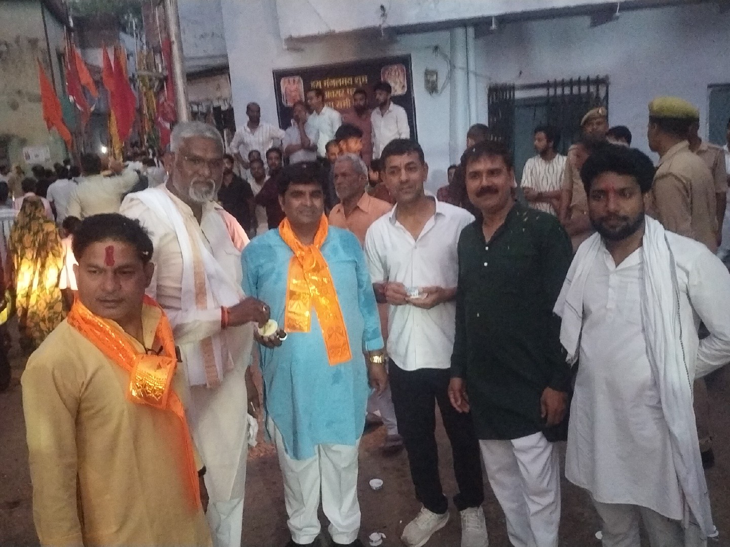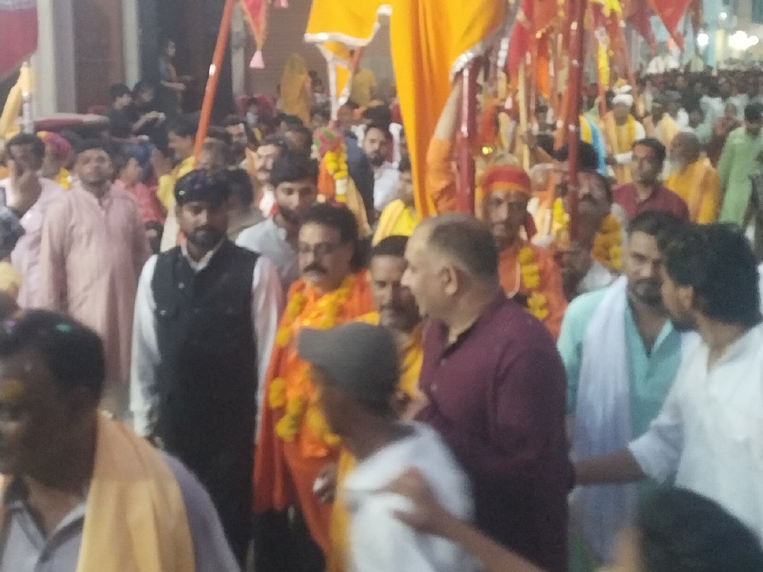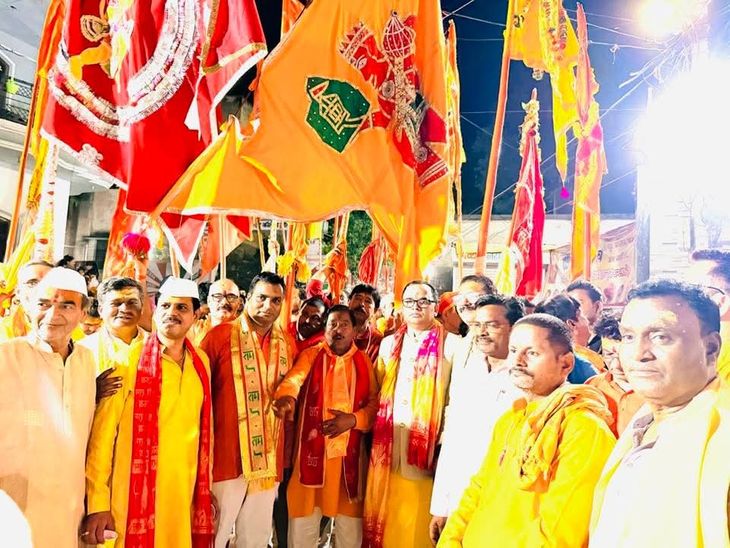 शोभायात्रा में सबसे आगे विभिन्न मंदिरों के पुजारी धर्म पताका लेकर चल रहे थे, जिनके पीछे हनुमान जी की झांकी और अखाड़े के युवा करतब दिखाते हुए चल रहे थे।