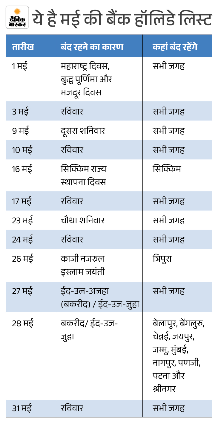 महीने की शुरुआत यानी 1 मई को छुट्टी से होगी। महाराष्ट्र दिवस, बुद्ध पूर्णिमा और मजदूर दिवस (लेबर डे) पर देश में लगभग सभी जगह बैंक के कारण बंद रहेंगे। यहां देखें मई 2026 में आपके राज्य या लोकेशन में बैंक कब-कब बंद रहेंगे…