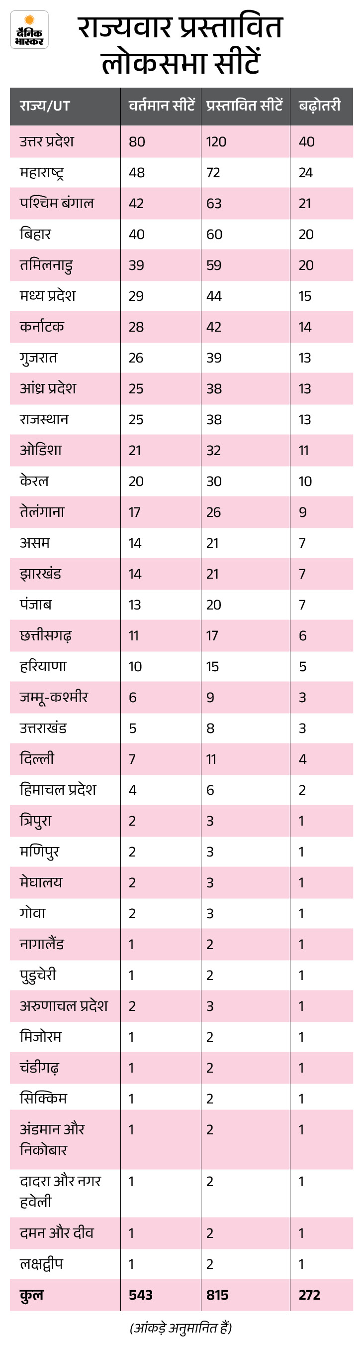 कितनी सीटें बढ़ेंगी: लोकसभा सीटें 543 से बढ़ाकर अधिकतम 850 हो जाएंगी। राज्यों में 815 व केंद्र शासित क्षेत्रों के लिए 35 सीटें। इस बदलाव का असर राज्यसभा और देश की सभी विधानसभाओं पर भी होगा। यहां भी सीटें की संख्या बदल जाएंगी।