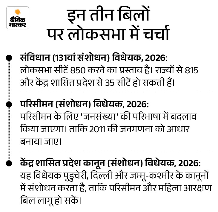 1. कौन से बिल पेश होंगे: संविधान (131वां संशोधन) बिल, परिसीमन विधेयक (संशोधन) बिल और केंद्र शासित प्रदेश कानून (संशोधन) बिल, 2026 बिल पेश किए जाएंगे। इस पर चर्चा होगी।