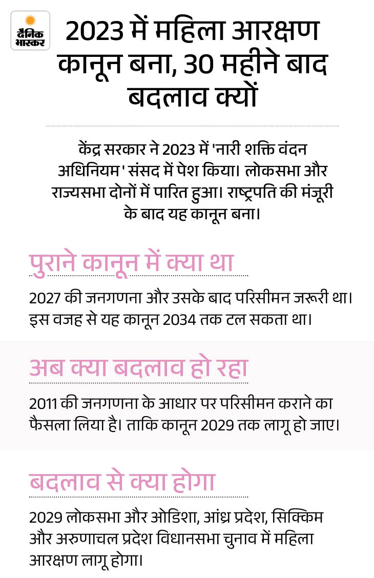 अभी तक सीटों का आधार 1971 की जनगणना थी, जो 2026 तक के लिए मान्य थी। परिसीमन कब होगा और किस जनगणना (जैसे 2011 या 2027) के आधार पर होगा, यह संविधान की जगह संसद एक साधारण कानून बनाकर तय कर सकेगी।