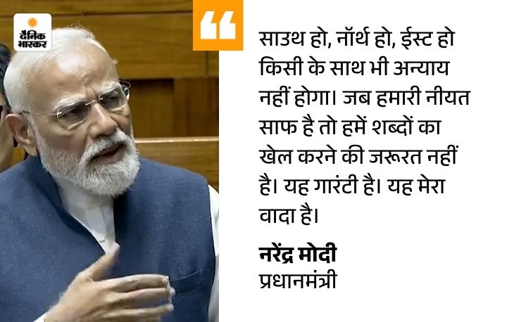 मोदी ने कहा- मैं कहना चाहूंगा कि यहां बैठकर हमें संविधान ने देश को टुकड़ों के रूप में सोचने का अधिकार ही नहीं दिया है। कश्मीर हो या कन्या कुमारी हम एक देश के रूप में ही इसे सोच सकते हैं। राजनीतिक लाभ लेने के लिए जो बवंडर खड़ा किया जा रहा है उस पर मैं जिम्मेवारी के साथ कहना चाहता हूं कि निर्णय प्रक्रिया किसी के साथ भी भेदभाव नहीं करेगी।