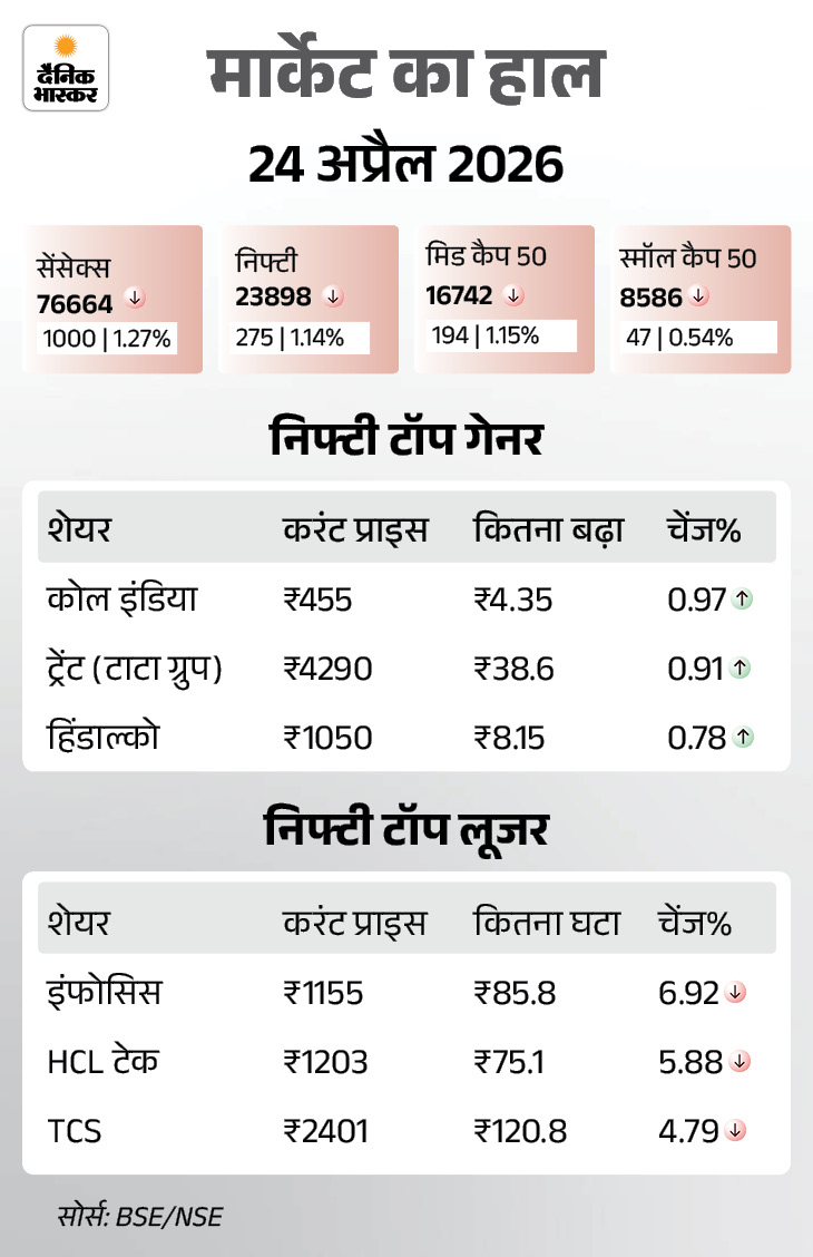 हफ्ते के आखिरी कारोबारी दिन शुक्रवार 24 अप्रैल को सेंसेक्स 1000 अंक (1.29%) की गिरावट के साथ 76,664 पर बंद हुआ। निफ्टी भी 275 अंक (1.14%) गिरकर 23,898 के स्तर पर आ गया। आज के कारोबार में आईटी शेयरों में सबसे ज्यादा बिकवाली रही।