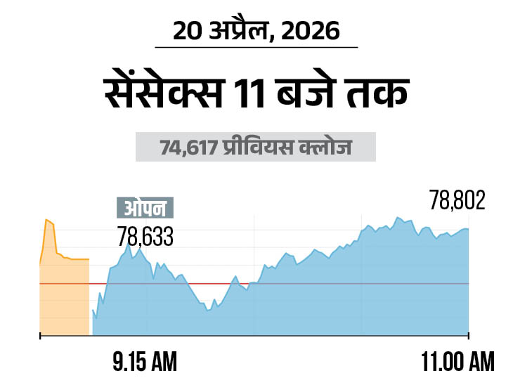 शेयर बाजार में आज यानी सोमवार, 20 अप्रैल को बढ़त है। सेंसेक्स करीब 300 अंक की तेजी के साथ 78,800 पर कारोबार कर रहा है। निफ्टी में भी करीब 100 अंक की बढ़त है, ये 24,450 के स्तर पर कारोबार कर रहा है। आज बैंकिंग और एनर्जी शेयर्स में ज्यादा खरीदारी है।