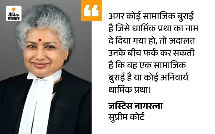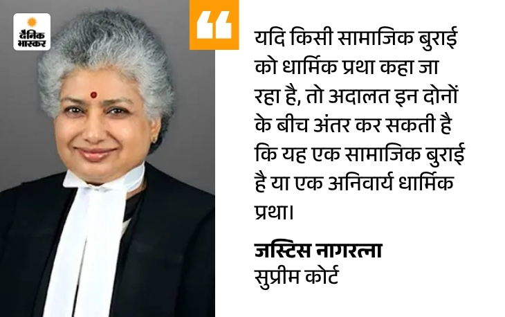 - जस्टिस नागरत्ना ने कहा कि अगर कोई सामाजिक बुराई है, जिसे धार्मिक प्रथा का नाम दे दिया गया हो तो अदालत उनके बीच फर्क कर सकती है कि वह एक सामाजिक बुराई है या कोई अनिवार्य धार्मिक प्रथा है। इस पर केंद्र ने कहा कि संवैधानिक दृष्टि से इसका जवाब यह होगा कि इसका समाधान अनुच्छेद 25(2)(b) में है, यानी संसद इस पर कानून बना सकती है।