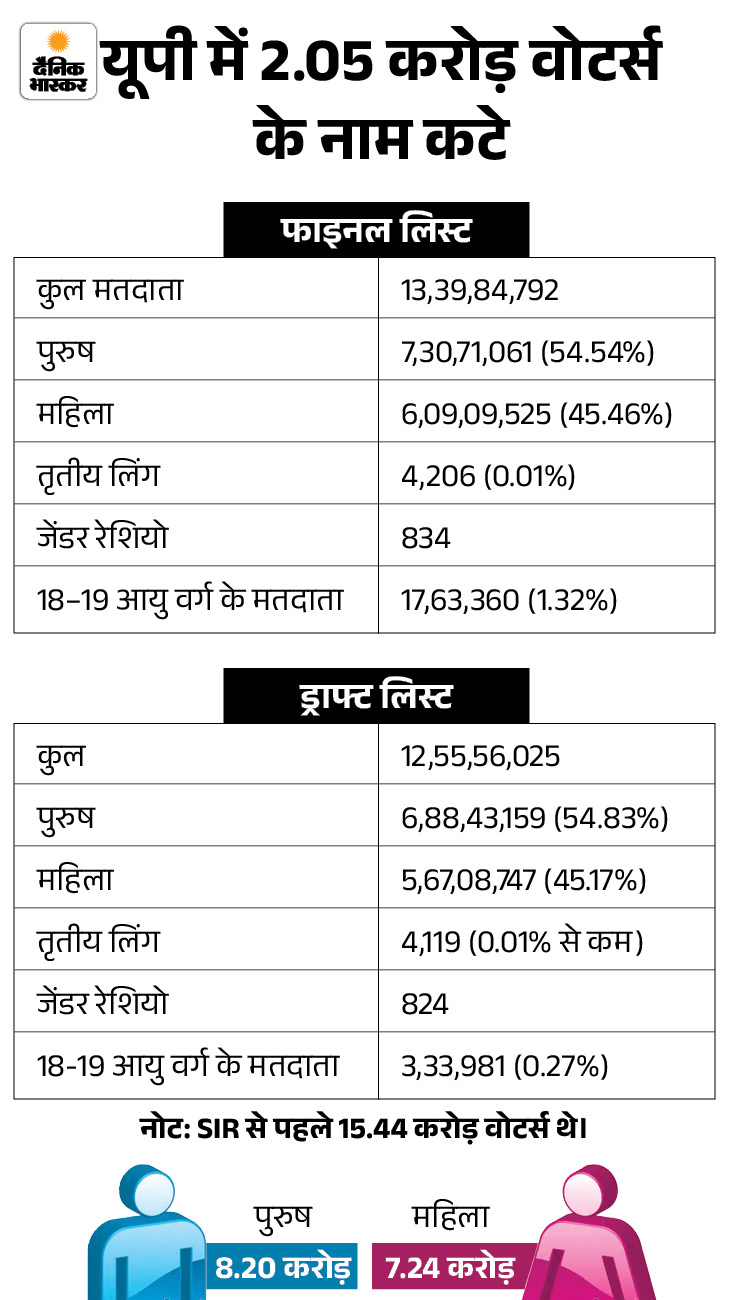 यूपी में चुनाव आयोग ने स्पेशल इंटेंसिव रिवीजन (SIR) की फाइनल लिस्ट शुक्रवार को जारी कर दी। यूपी में वोटर्स की संख्या 13% घटकर 13.39 करोड़ हो गई है। फाइनल लिस्ट से 2.05 करोड़ नाम कटे हैं। 84 लाख नए नामों को जोड़ा गया है।