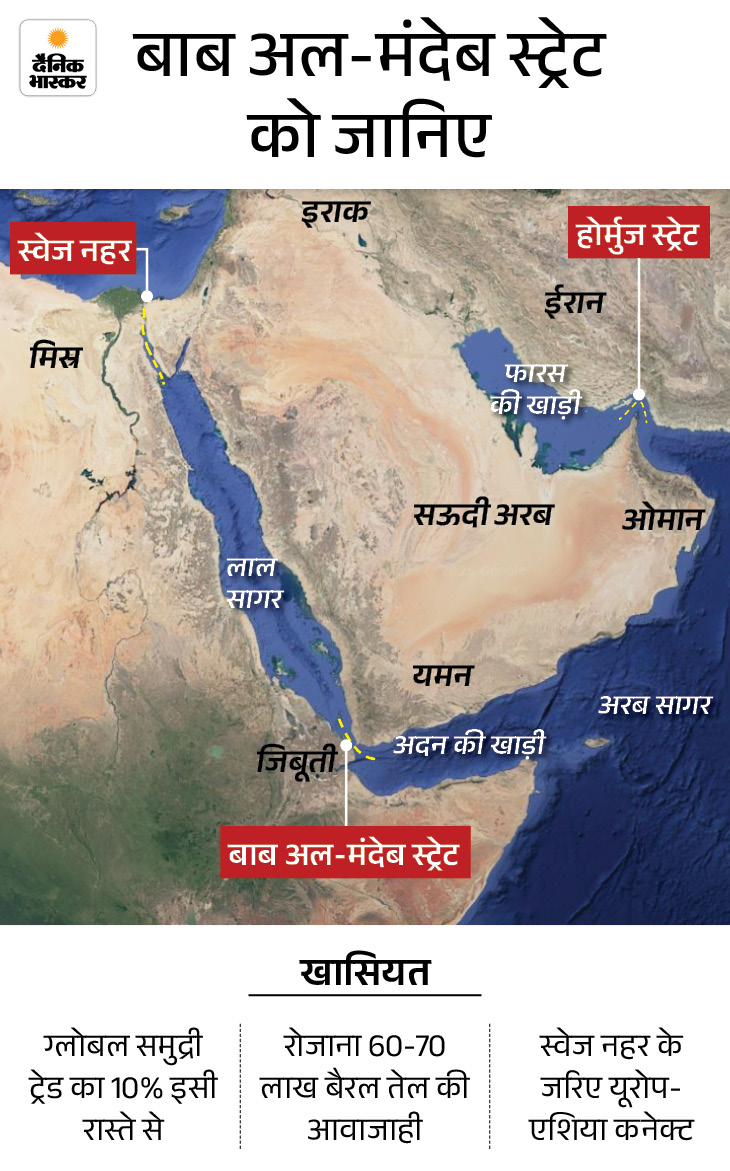 बाब-अल-मंदेब स्ट्रेट दुनिया के सबसे अहम समुद्री रास्तों में गिना जाता है। यह रेड सी को अदन की खाड़ी से जोड़ता है और हर साल करीब 20 हजार जहाज यहां से गुजरते हैं।