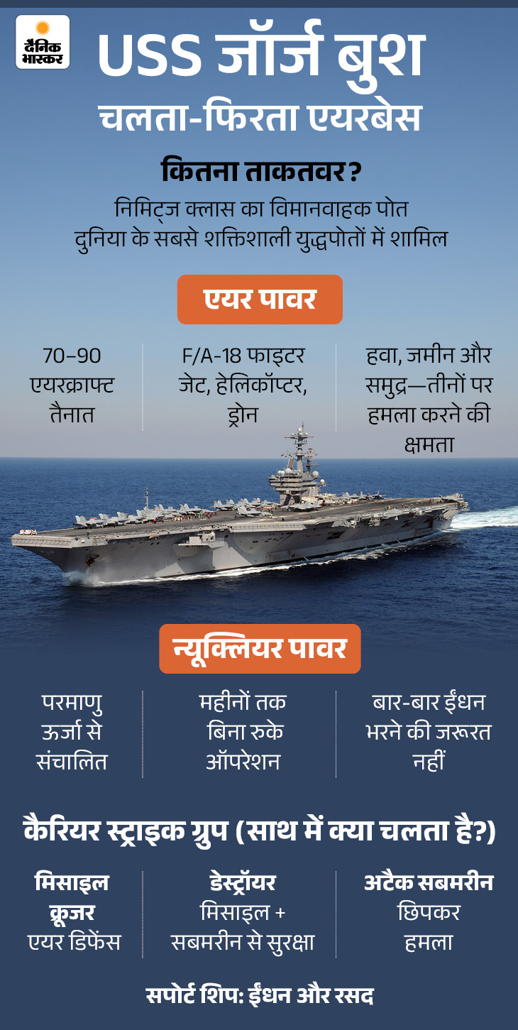 USS जॉर्ज एचडब्ल्यू बुश अमेरिका का 10वां और आखिरी निमिट्ज क्लास न्यूक्लियर पावर्ड सुपरकैरियर है। निमिट्ज अमेरिका के सबसे बड़े और सबसे ताकतवर युद्धपोतों की एक खास श्रेणी (क्लास) है, जो परमाणु ऊर्जा से चलते हैं और जिन पर लड़ाकू विमान तैनात होते हैं।