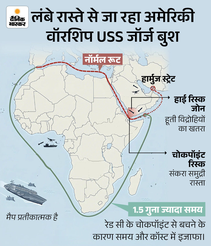 यह जहाज अब डेढ़ गुना ज्यादा दूरी तय करते हुए अफ्रीका का पूरा चक्कर लगाकर ईरान के करीब पहुंच रहा है। रिपोर्ट्स के मुताबिक रेड सी का रास्ता हूती विद्रोहियोंं क खतरे से भरा है। जिससे ही बचने के लिए यह अमेरिकी सुपरकैरियर लंबा रास्ता लेने को मजबूर है।
