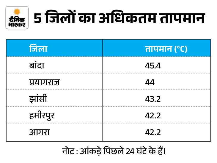 उत्तर प्रदेश में भीषण गर्मी पड़ रही है। यूपी का बांदा जिला देश में सबसे गर्म रहा। यहां तापमान 45°C के पार पहुंचकर 45.4°C तक रिकॉर्ड किया गया। इसके अलावा प्रदेश के 17 जिलों में तापमान 40°C से अधिक दर्ज किया गया, जिससे लोगों को तेज धूप और लू का सामना कर