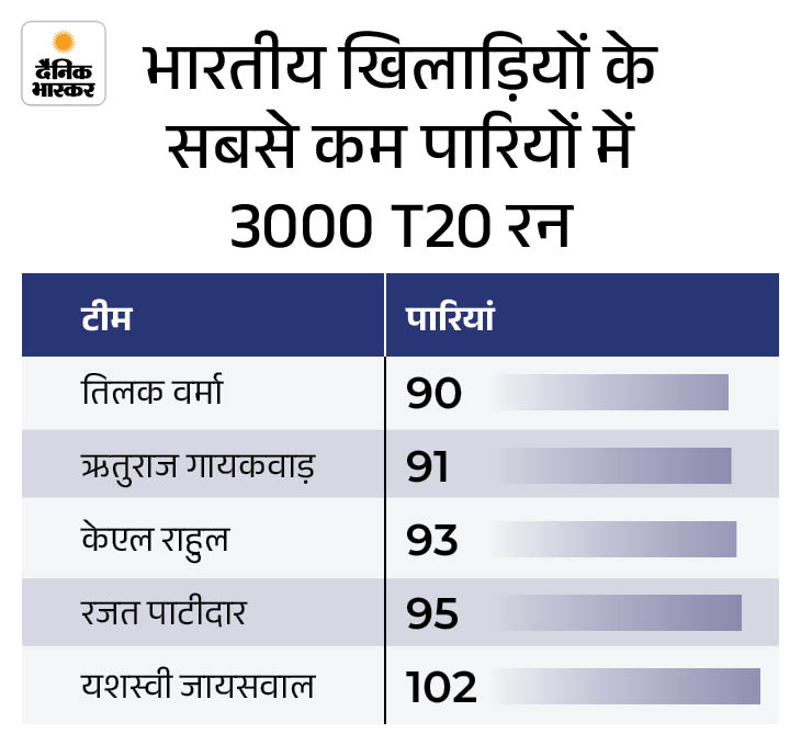 रजत पाटीदार ने 95 पारियों में 3000 T20 रन पूरे कर लिए हैं। वह इस लिस्ट में चौथे नंबर पर हैं। सबसे तेज 3000 रन का रिकॉर्ड तिलक वर्मा (90 पारियां) के नाम है, जबकि दूसरे नंबर पर ऋतुराज गायकवाड़ (91) और तीसरे नंबर पर केएल राहुल (93) हैं।