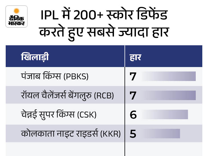 4. RCB 7वीं बार 200+ रन बनाकर हारी RCB ने 200+ स्कोर बनाने के बाद 7वीं बार मैच गंवाया, जिससे वह PBKS के साथ संयुक्त रूप से पहले स्थान पर पहुंच गई है। CSK 6 हार के साथ तीसरे नंबर पर है, जबकि KKR (5) चौथे स्थान पर है।