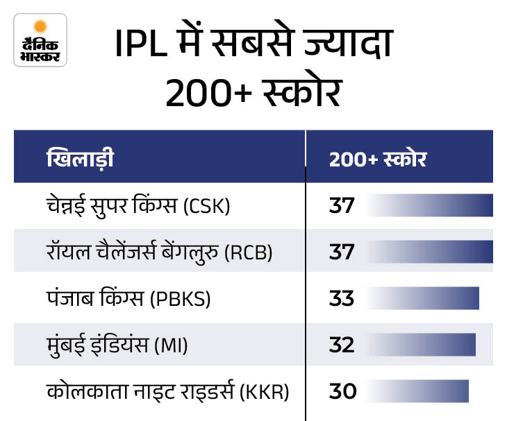 RCB ने IPL में 37वीं बार 200+ का स्कोर बनाकर CSK की बराबरी कर ली है। अब दोनों टीमें इस लिस्ट में संयुक्त रूप से पहले नंबर पर हैं। तीसरे नंबर पर PBKS (33) है, जबकि MI (32) चौथे और KKR (30) पांचवें स्थान पर हैं।