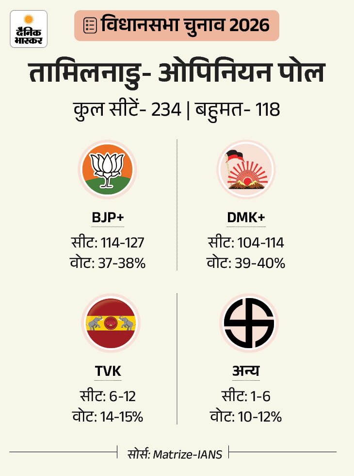 तमिलनाडु की 231 सीटों में से सर्वे में DMK+ को 104-114 सीटें मिलने का अनुमान है, जबकि AIADMK-BJP गठबंधन को 114-127 सीटें मिल सकती हैं।
